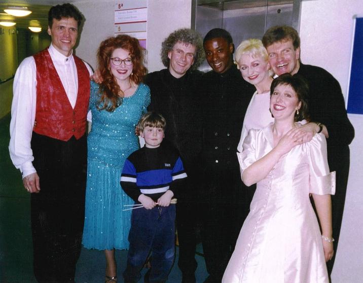 After West Side Story at Symphony Hall Birmingham: from l to r: Brent Barratt, Kim Criswell, Sir Simon Rattle, Wayne Marshall, Liz Izen, Mary Carewe and Me (Simon's son in the forground)